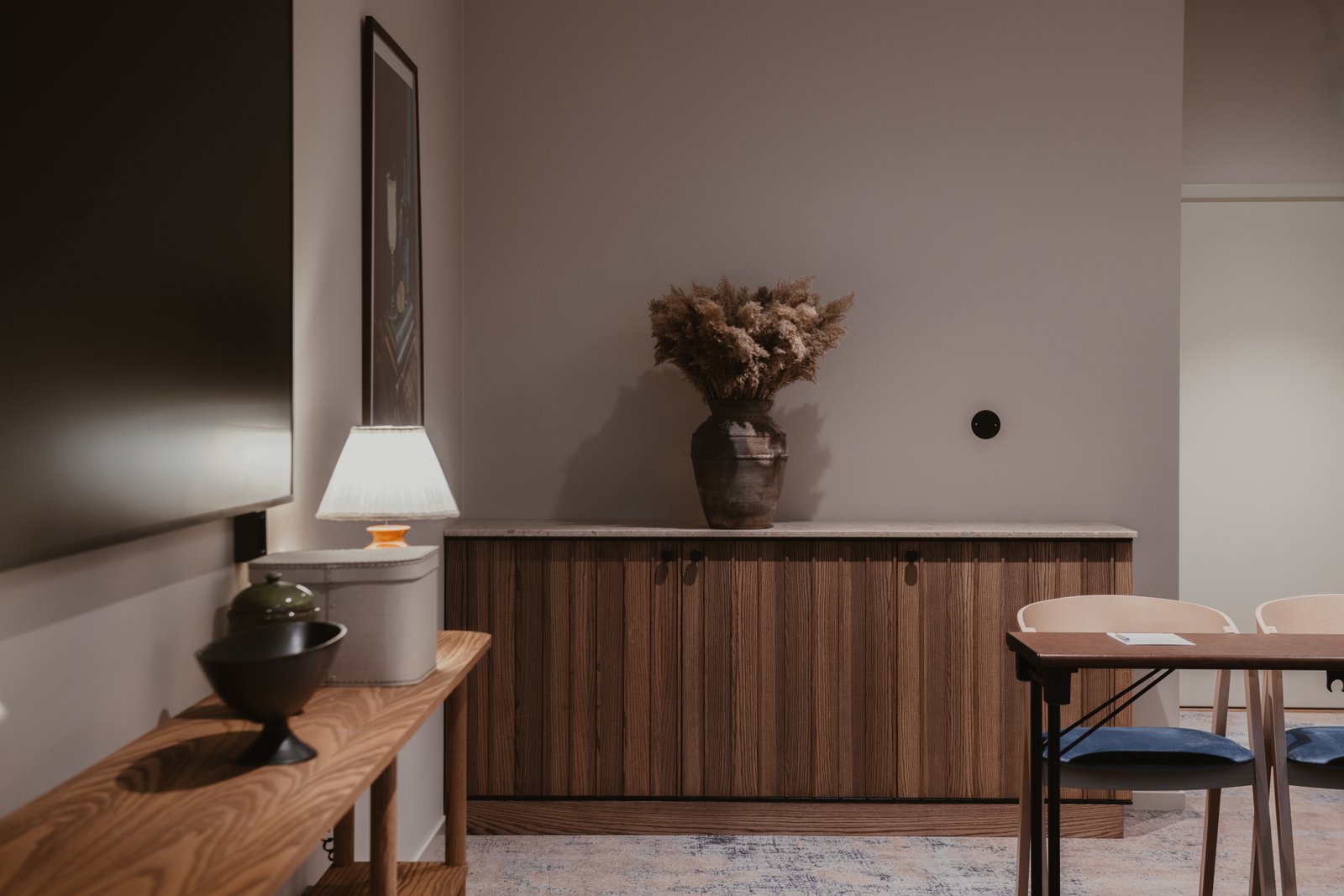 Lokalen har en 85″ TV-skĂ€rm av modell Samsung QM85C 500Nits 16/7. Det erbjuds fast anslutning via HDMI. Kamera och soundbar ger möjlighet till videokonferens.